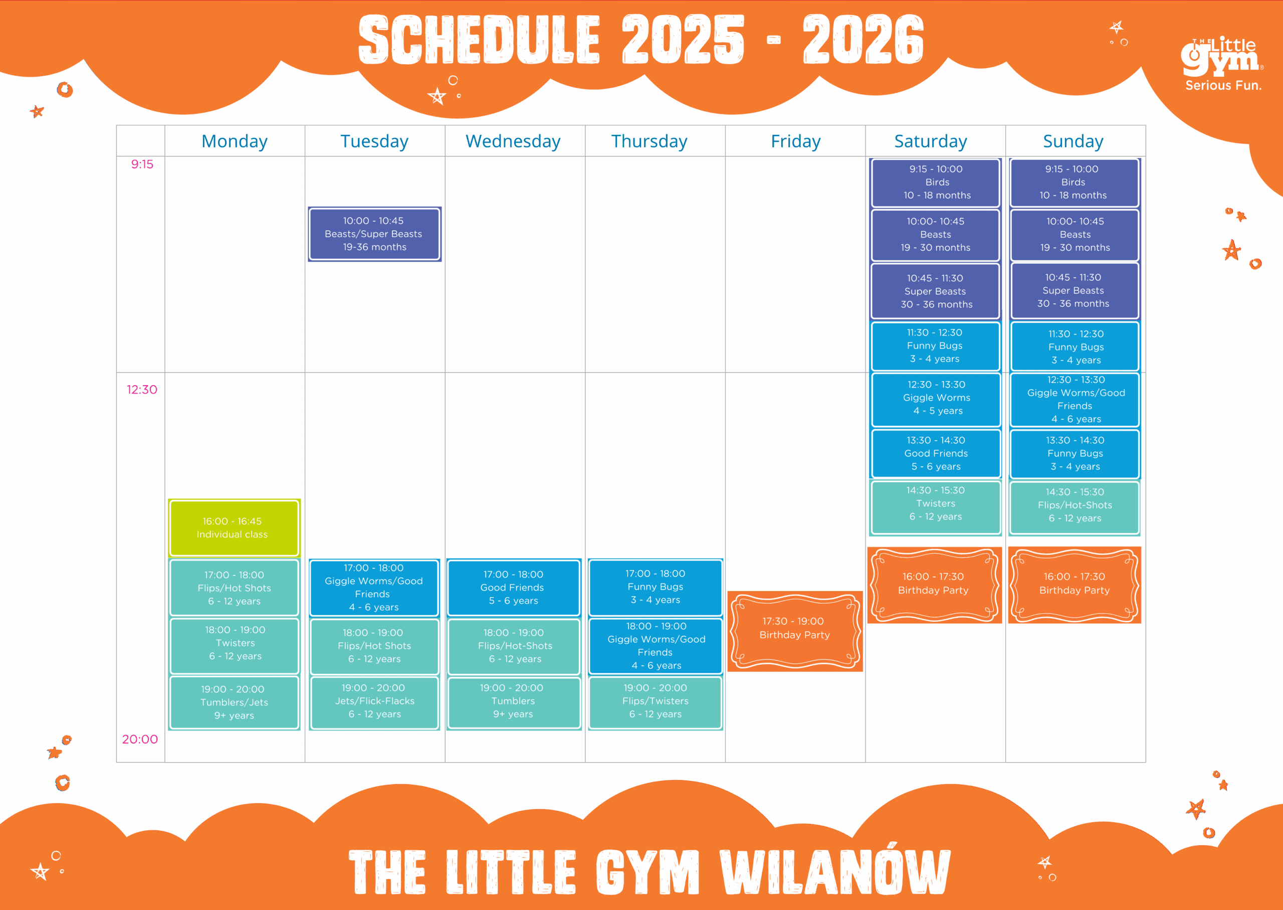 The Little Gym oferuje pełne energii, dostosowane do wieku zajęcia odbywające się co tydzień według stałego harmonogramu. Pomagają one Twojemu dziecku w kompleksowym rozwoju i stają się stałym elementem jego rutyny!